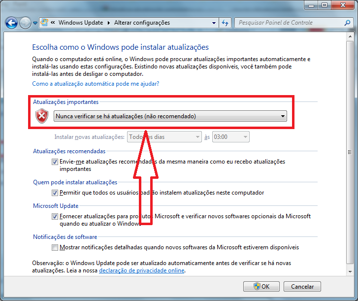 Abra o menu drop-down constante na área Atualizações importantes, selecione e clique em Nunca verificar se há atualizações e desmarque todas as opçoes: